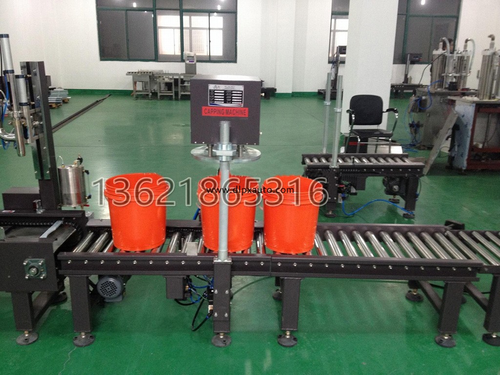 CrossQ自動稱重灌裝旋蓋線 FM-ASW/20L 工作流程:手動放桶---自動輸送----自動定位灌裝----手動放蓋-----自動壓蓋---- --自動輸送。