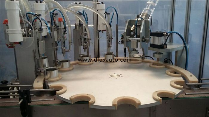 將瓶子放入進(jìn)瓶設(shè)備,有輸送機(jī)將瓶子轉(zhuǎn)入灌裝位,自動灌裝,灌裝后再自動進(jìn)入上蓋,當(dāng)瓶子轉(zhuǎn)到自動上蓋過程中,瓶口碰到蓋,后面從蓋槽中
