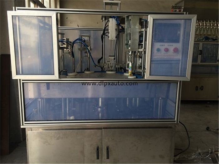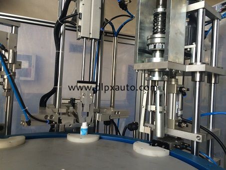 有輸送機(jī)將瓶子轉(zhuǎn)入灌裝位,自動(dòng)灌裝,灌裝后再自動(dòng)進(jìn)入旋蓋,當(dāng)瓶子轉(zhuǎn)到自動(dòng)旋蓋過(guò)程中,瓶蓋有機(jī)械手夾子夾住瓶蓋,將瓶蓋送入瓶口上,