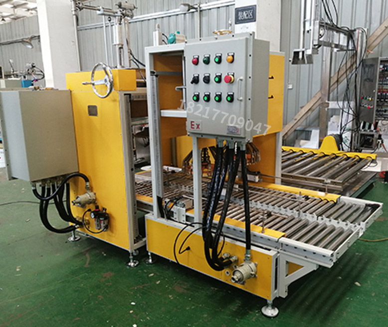 設備流程:操作時,操作者僅需簡單地將桶口對準灌裝頭正下方,按下的[啟動]按鈕,系統(tǒng)會自動將空桶自動去皮。然后打開灌裝頭閥門,精確地雙速灌裝;灌裝結(jié)束,灌裝頭閥門自動關閉,人工將桶推出磅臺上蓋壓蓋即告完成。