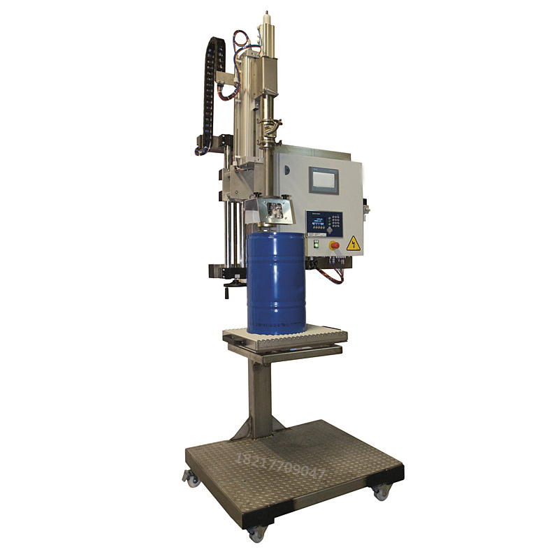 設(shè)備流程:上空桶/人工對(duì)桶--按[啟動(dòng)]鍵--槍頭自動(dòng)插入桶內(nèi)---泵啟動(dòng)---自動(dòng)雙速度灌注 --完成灌裝泵停止---自動(dòng)提槍---槍頭自動(dòng)防滴漏---人工移動(dòng)實(shí)桶/人工壓蓋;