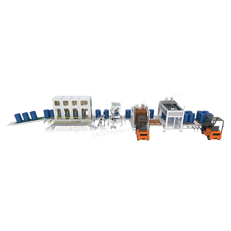 灌裝結(jié)束,灌裝秤頭自動提升至桶外,滴漏盤自動接至灌裝頭底部灌裝完成,輸送線啟動自動將成品桶輸送至鎖蓋區(qū),人工鎖蓋完成自動輸送至成品區(qū),叉車叉走成品桶整個灌裝流程結(jié)束!
