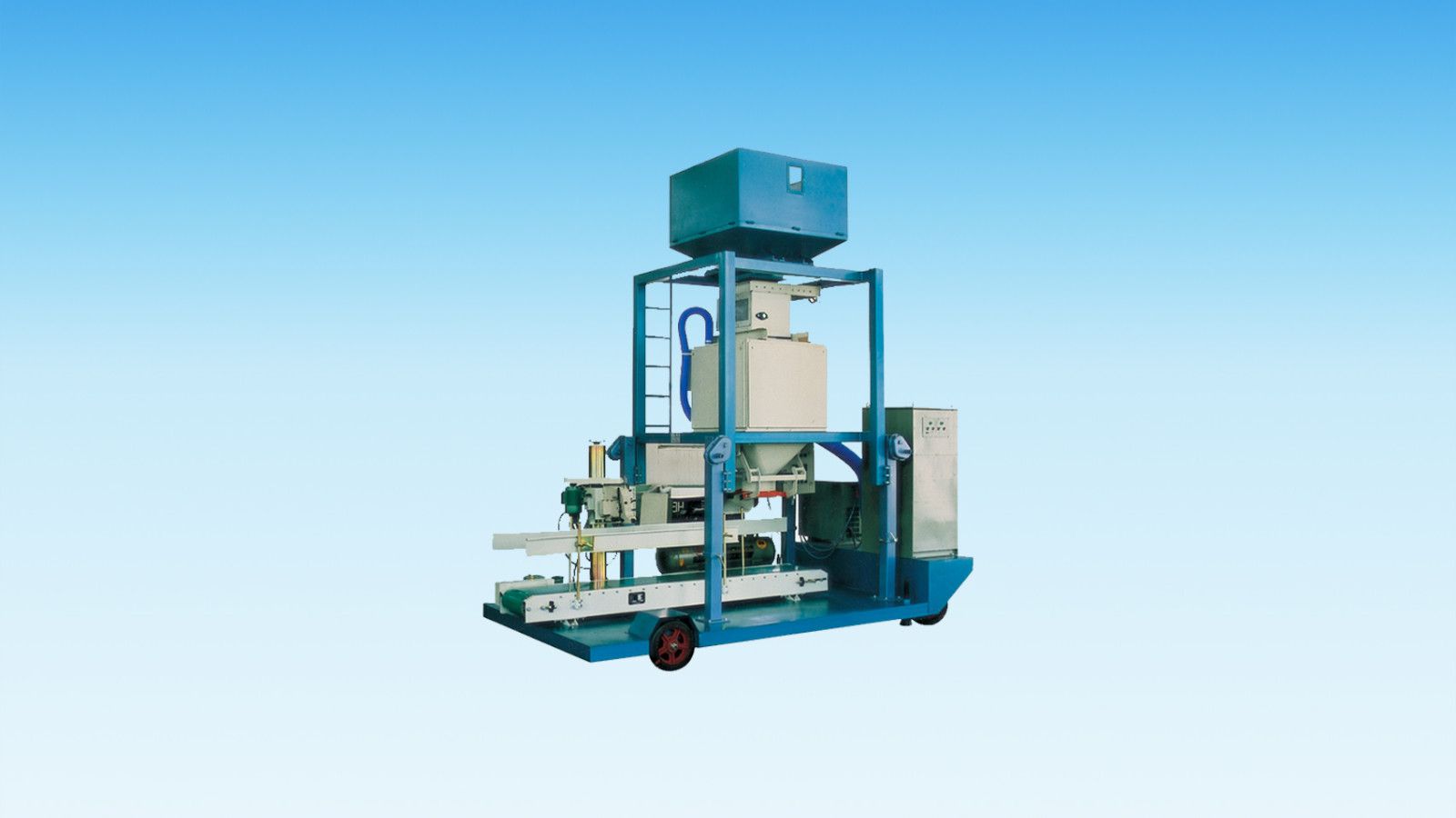 移動(dòng)式定量包裝秤集成了定量包裝秤、空壓機(jī)、皮帶輸送機(jī)、縫紉機(jī)、移動(dòng)