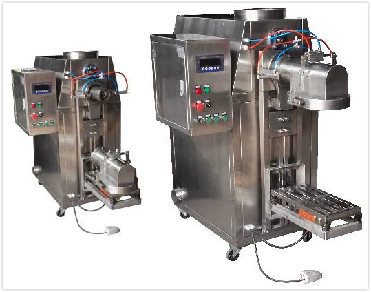 將閥口包或敞口袋裝袋套在加料嘴上,按動“允加”按鈕,這時壓袋氣缸開始工作并壓住袋口,控制器將包裝袋重量自動去除,破拱電機緩慢轉(zhuǎn)動,保證下料暢通。加料螺旋高速轉(zhuǎn)動迅速將物料灌入袋中,隨袋中空氣一起溢出的粉塵通過吸塵器由除塵器吸走,振動裝置同時啟動將托盤上袋中物料振實充滿袋角。待加料快到設(shè)定值時,加料螺旋進行減速慢加,到設(shè)定值時,加料停止。誤差<0.3%。這時壓袋氣缸松開袋口,翻袋氣缸將托盤翻轉(zhuǎn),將物料翻倒在皮帶輸送機上及時送出。